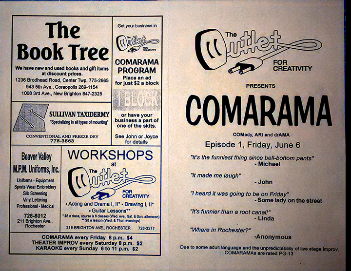 Comarama (COMedy, ARt, and drAMA) was a weekly variety show featuring the Outlet's in-house theater troupe "The Cellar Dwellers". Each show consisted of original comedy sketches, dramatic acts, musical and art numbers, a regular opening short film, and every show was followed by theater improv open to the audience. The Outlet also produced and staged additional Comaramas featuring its teen acting troup, the Jr. Dwellers.